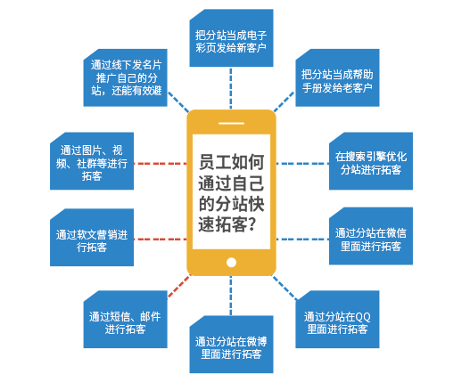 员工利用自己的分站可以通过多种场景拓客,如上图所示